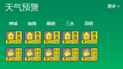 目前,佛山五区高温黄色预警、森林火险黄色预警生效中。请注意做好森林防火工作。