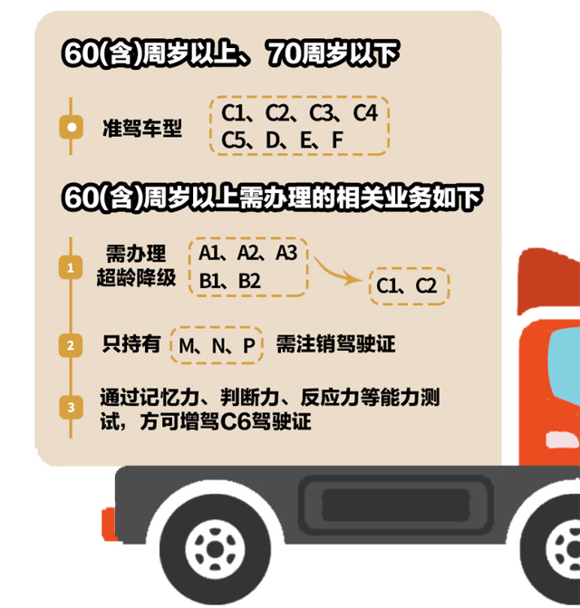 ✍年龄在60周岁以上、70周岁以下,申请轻型牵引挂车、普通三轮摩托车、普通二轮摩托车准驾车型的。