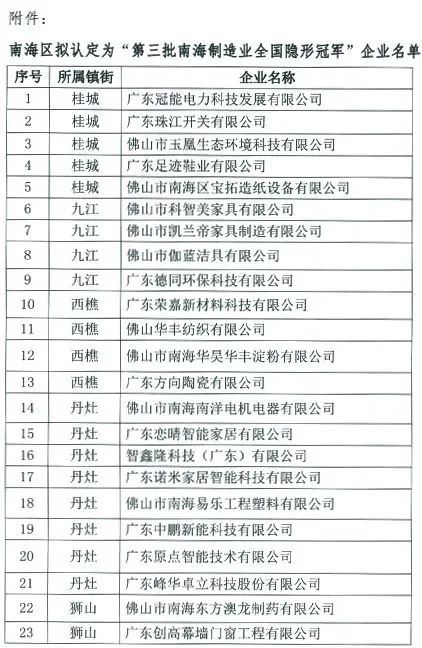 经征集报名、实地调研、评审委员会评审等程序,广东冠能电力科技发展有限公司等39家企业拟认定为第三批南海制造业全国隐形冠军。