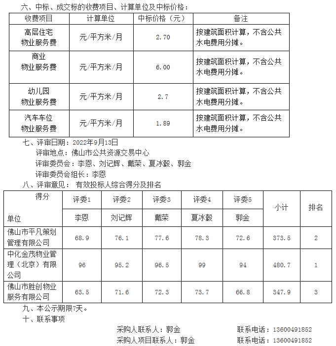 佛山拓茂房地产开发有限公司于2022年9月13日就朝安金茂悦公馆前期物业管理招标(项目编号:JW2022(SZ)XY0019)采用邀请招标方式进行招标,佛山市公共资源交易中心对开标、评标过程进行了见证。现就本次招标的中标、成交结果公示如下: