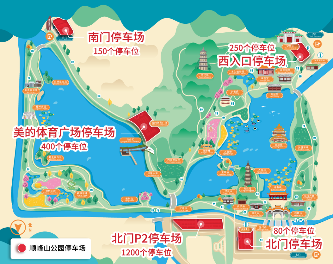 据统计,顺峰山公园内共设有5个停车场,车位约2000个,分别是: