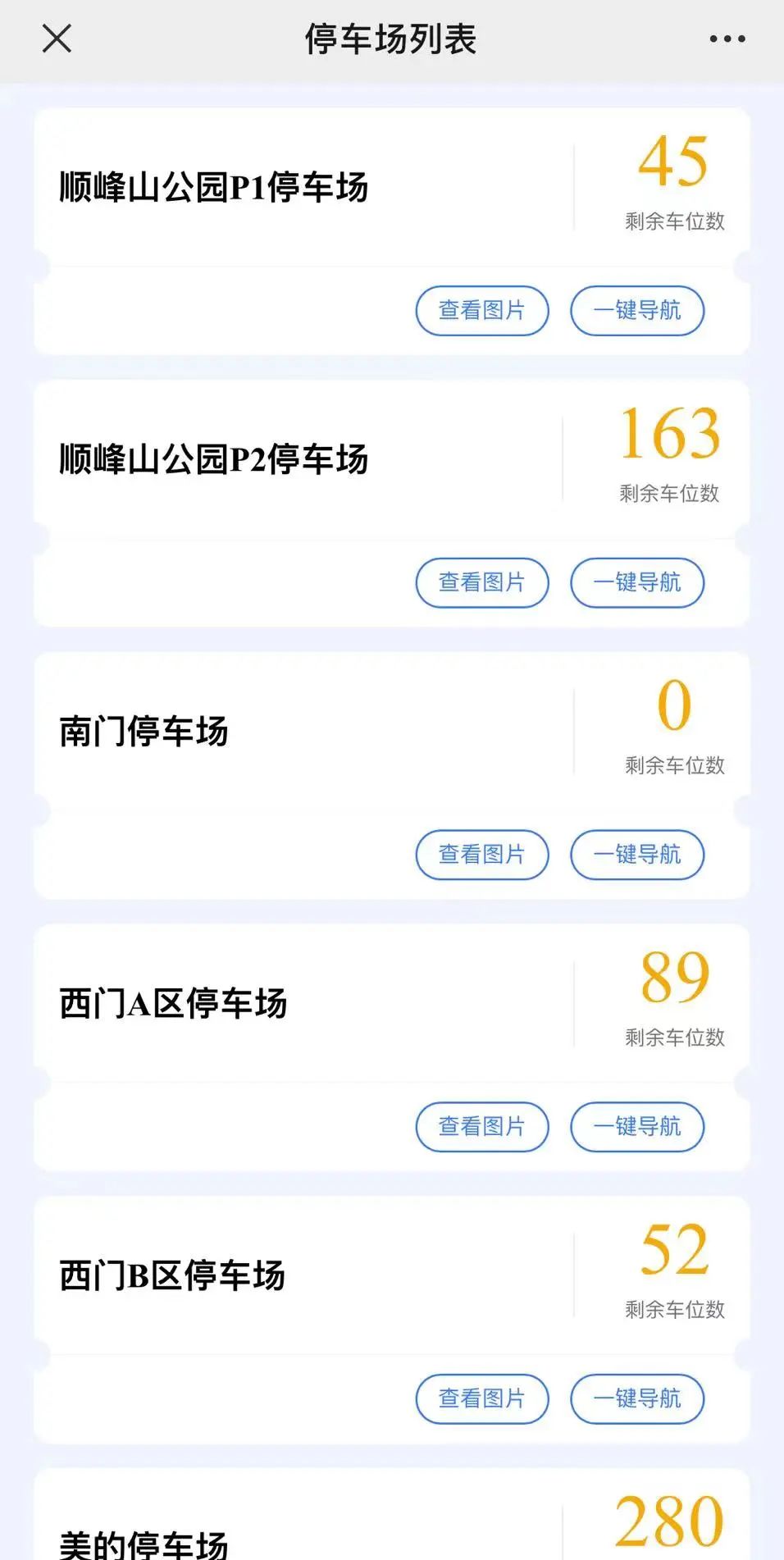 为方便市民游客寻找车位,顺峰山公园在微信公众号开通了实时查询剩余停车位服务。市民游客只需在“顺峰山公园”微信公众号,点击“停车信息”页面,即可了解公园各个停车场的实时停车位数量。