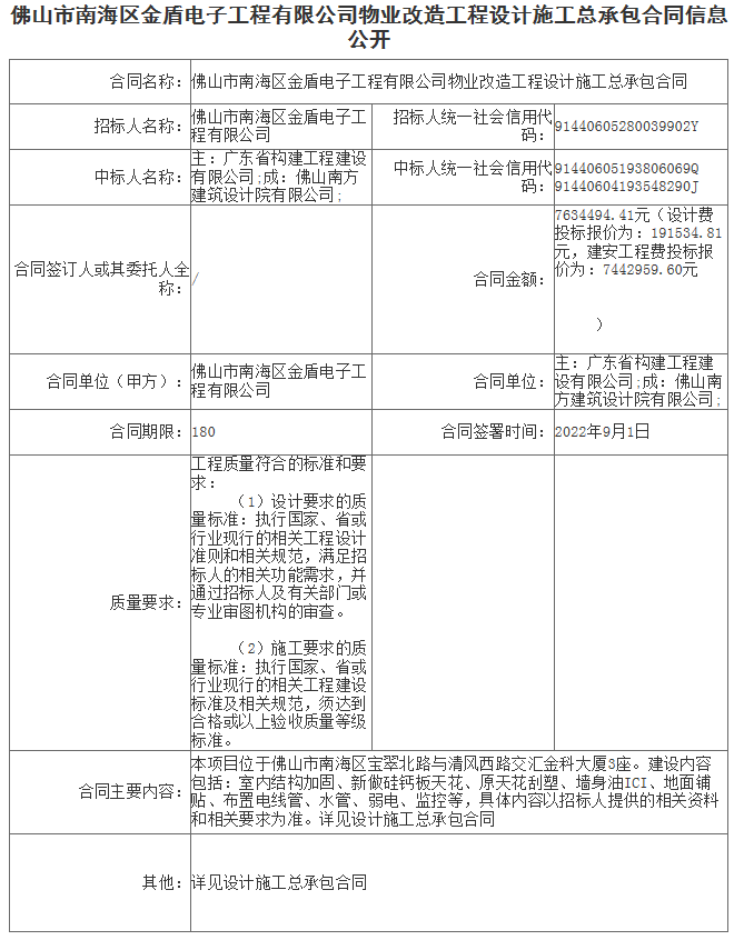 佛山市南海区金盾电子工程有限公司物业改造工程设计施工总承包合同信息公开