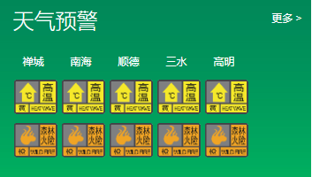 据佛山市气象台9月14日15时07分消息,预计未来三天,我市维持晴朗干燥天气,森林火灾容易发生,各区森林火险黄色预警信号升级为橙色,请注意森林防火、工业及家居用火安全。