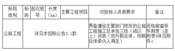 投标人(如为联合体,则联合体牵头人满足)应进入交通运输部“全国公路建设市场信用信息管理系统(http: glxy.mot.gov.cn)”中的公路工程施工资质企业名录,且投标人名称和资质与该名录中的相应企业名称和资质完全一致。