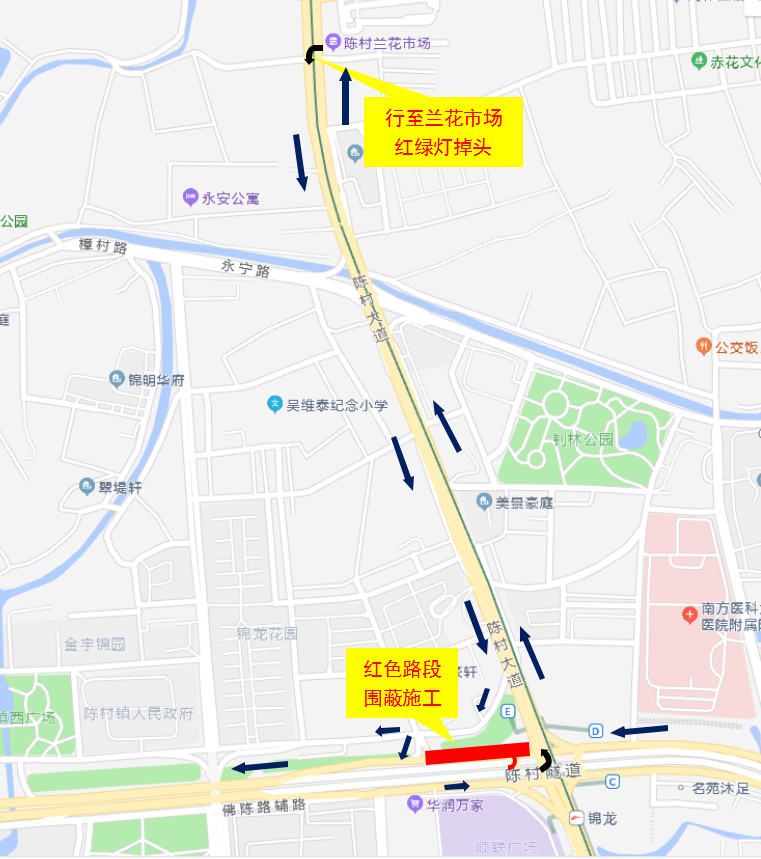 同时,佛陈路从禅城往陈村方向的车辆在该交汇处将不能直接从陈村隧道上方跨线车道掉头,须前行至红绿灯处左转至白陈路(陈村大道)兰花市场掉头。