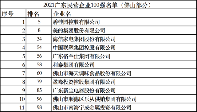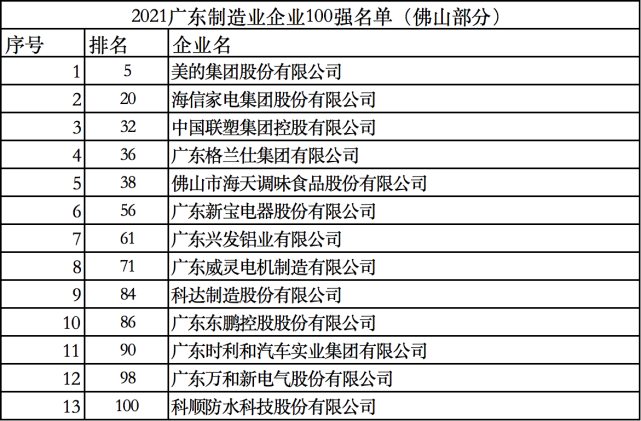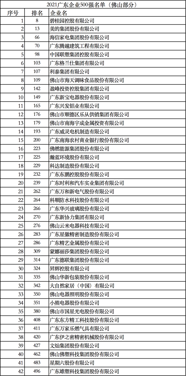 广东省企业联合会、广东省企业家协会近日发布2021广东企业500强系列榜单。佛山共有42家企业入围广东企业500强,11家企业入围广东民营企业100强,13家企业入围广东制造业企业100强。