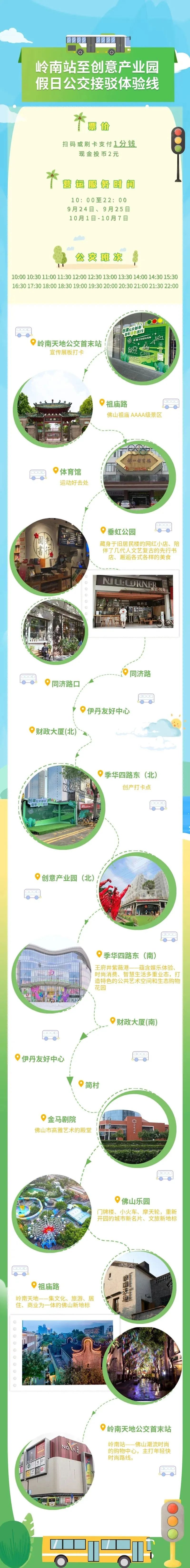 9月24、25日及国庆期间,禅城区开通岭南站至创意产业园假日公交接驳体验线,扫码或刷卡只需1分钱,即可体验地铁到商圈间无缝接驳。
