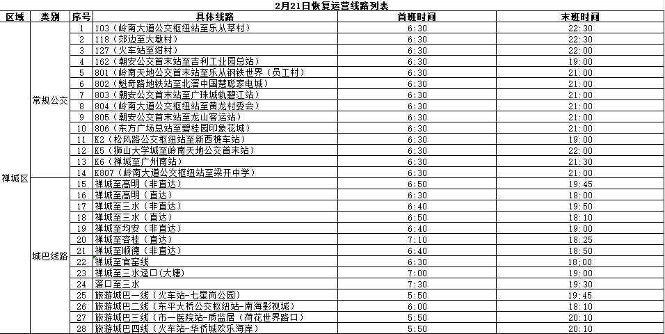 一、恢复运营的跨市、跨区公交和城巴线路执行线路原来的首末班时间,发班间隔视客流情况具体确定,线路信息详见下表。