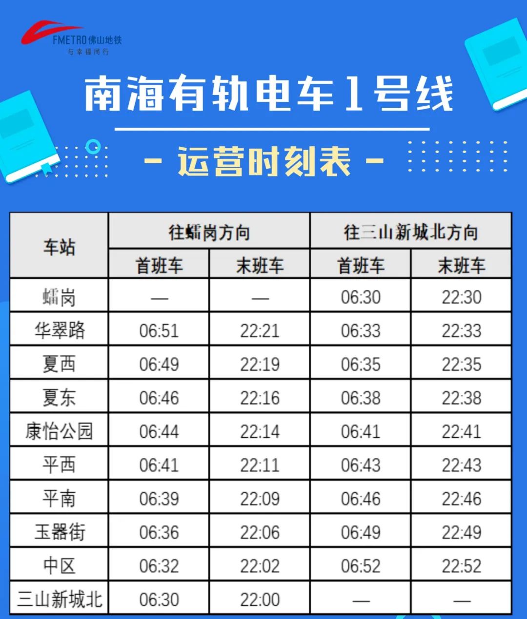 南海有轨电车 1 号线自 2022 年 10 月 1 日起恢复正常运营时间,即三山新城北站末班车时间为 22:00,?岗站末班车时间为 22:30。