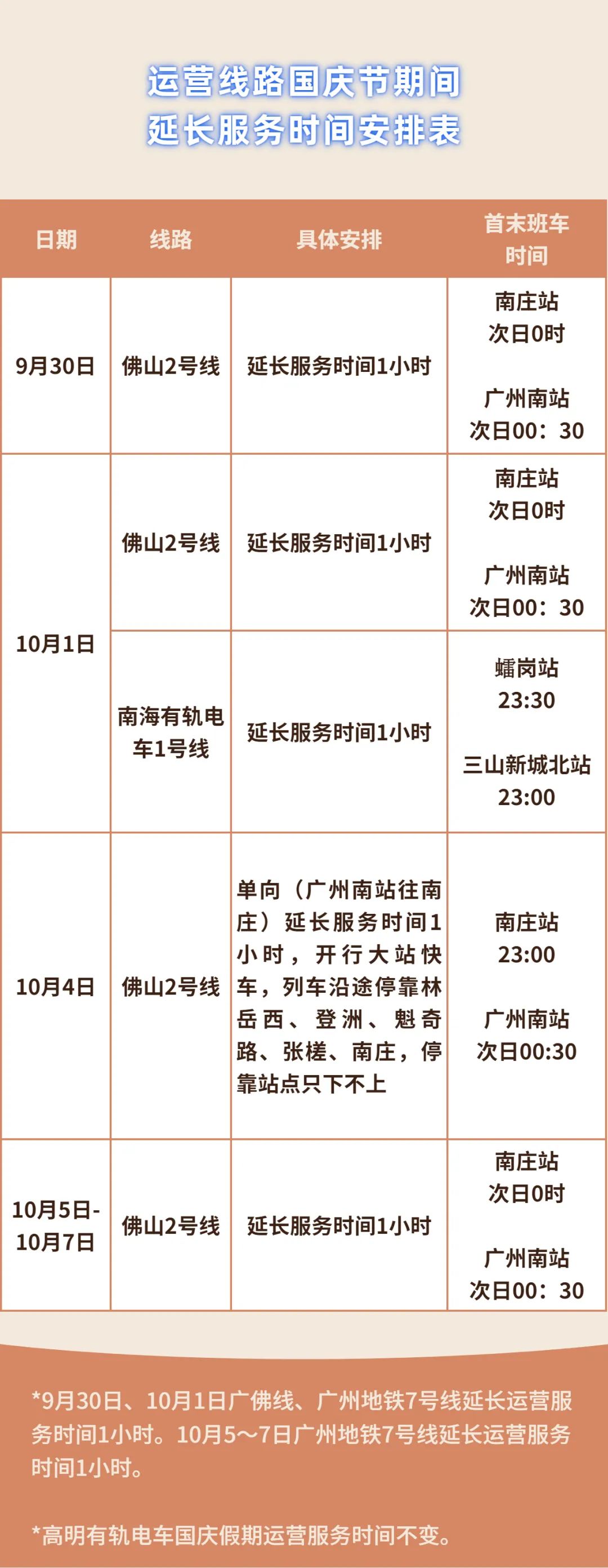 南海有轨电车1号线自2022年10月1日起恢复正常运营时间,即三山新城北站末班车时间为22:00,?岗站末班车时间为 22:30。而10月1日,南海有轨电车将延长1小时运营服务时间,请各位乘客留意!