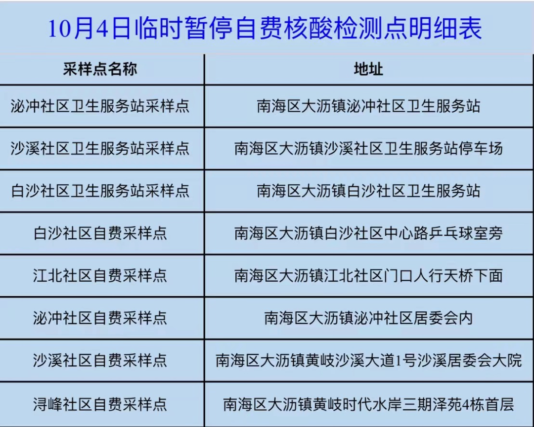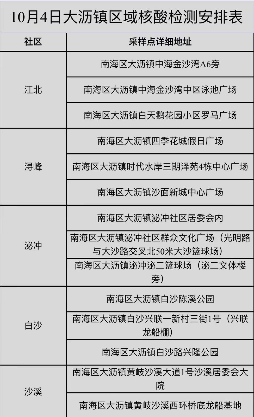 附件:10月4日大沥镇区域核酸检测安排表、10月4日临时暂停自费核酸检测点明细表