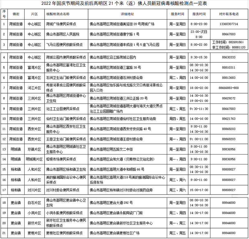 自9月30日起,高明区47个常态化便民核酸采样点已全部启用,服务对象覆盖来(返)佛人员、健康码为黄码人员、重点人群及其他有自费核酸检测需求人员。其中,高明21个核酸检测点,为48小时内外省市来(返)佛人员免费提供1次核酸检测服务。
