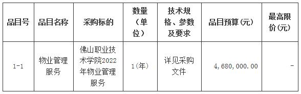 佛山职业技术学院2022年物业管理服务招标项目的潜在投标人应在广东省政府采购网https://gdgpo.czt.gd.gov.cn/获取招标文件,并于 2022年10月21日 09时00分 (北京时间)前递交投标文件。