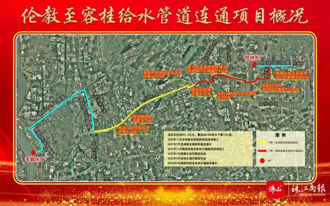 当天,通水仪式在容桂大桥侧举行,伦教至容桂给水管道工程敷设DN1200供水主干管道长约12公里,以龙洲路为起点,经南国西路至桂洲大福路,沿途穿越顺德支流、容桂水道。