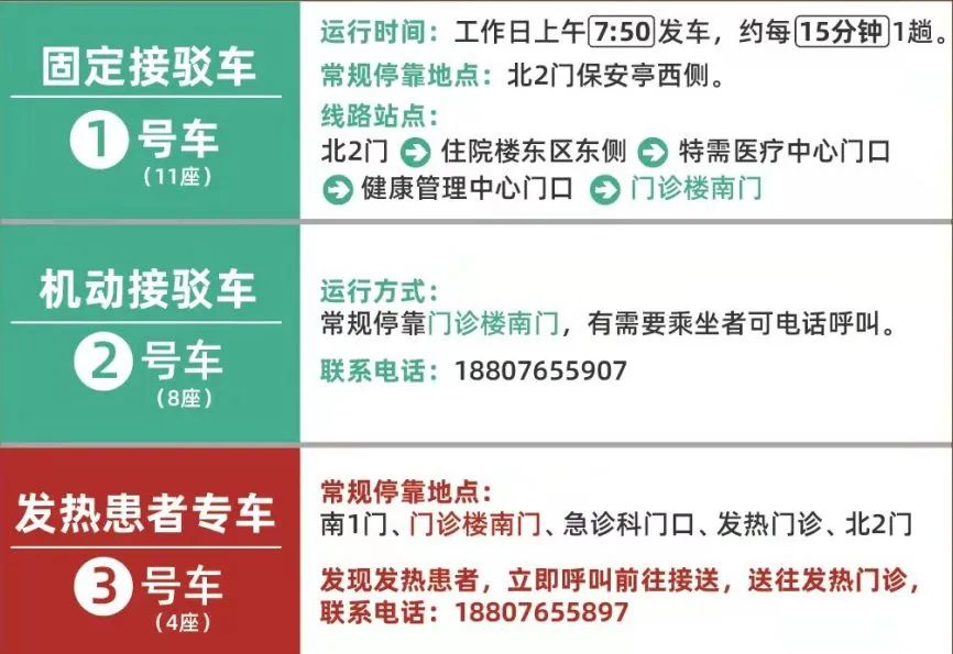 此外,医院内还免费提供电瓶车院内环线。为了方便行动不便的群众,医院增设了院内电瓶车,上班时间在院内环线。如有需要,市民可前往门诊楼南门、住院楼东区东侧、特需医疗中心门口、健康管理中心门口、北2门保安亭前乘坐。