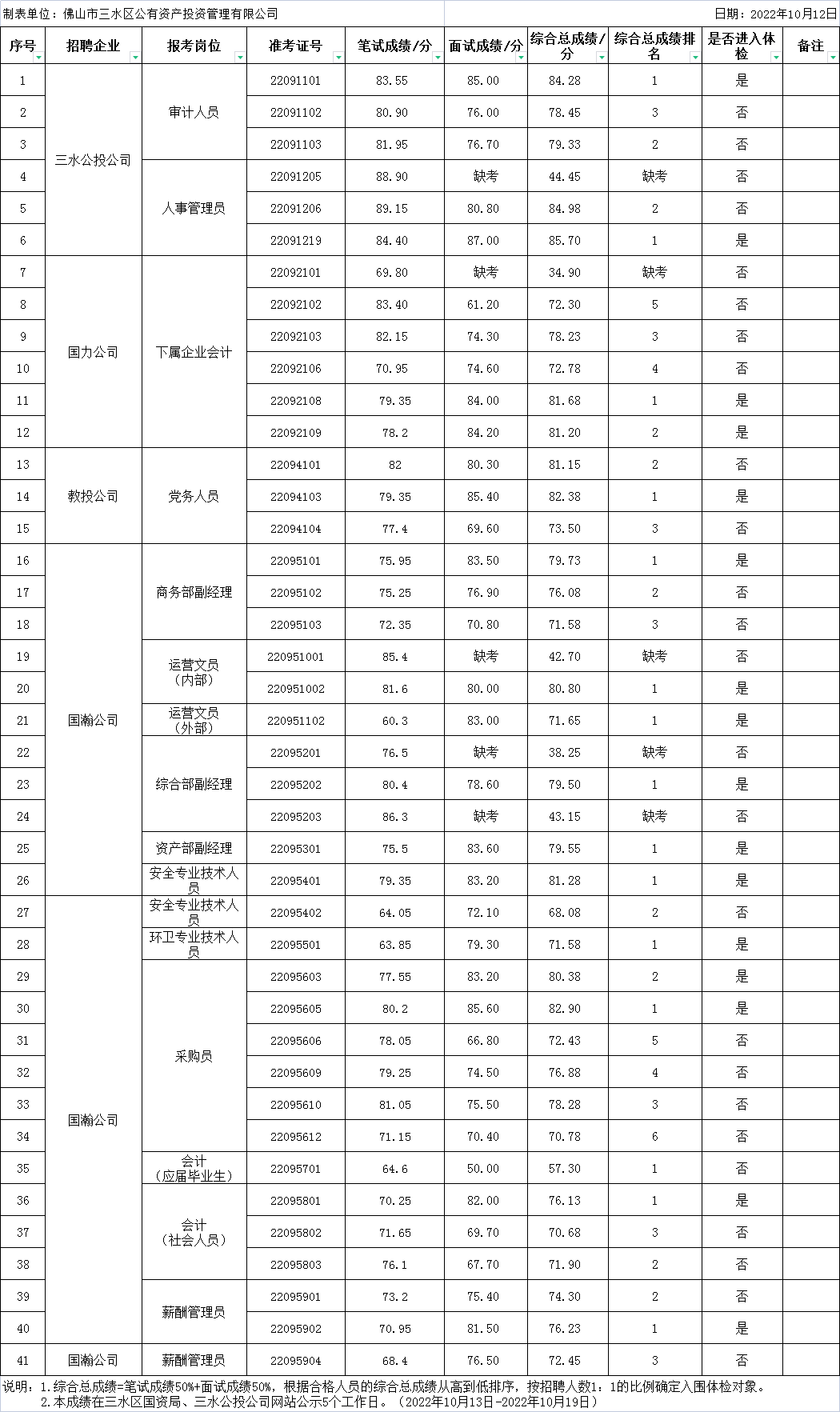 概述:佛山市三水区公有资产投资管理有限公司及下属企业2022年夏季公开招聘综合总成绩公示......