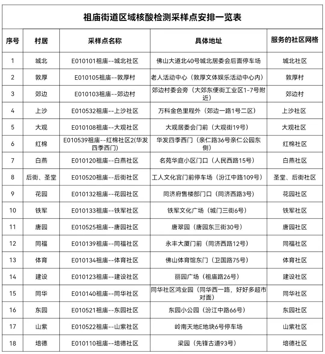 2.采样点:祖庙街道共设置18个免费核酸采样点分区域开展核酸检测,具体地点详见附表,请有检测需求的市民合理选择采样点就近检测。