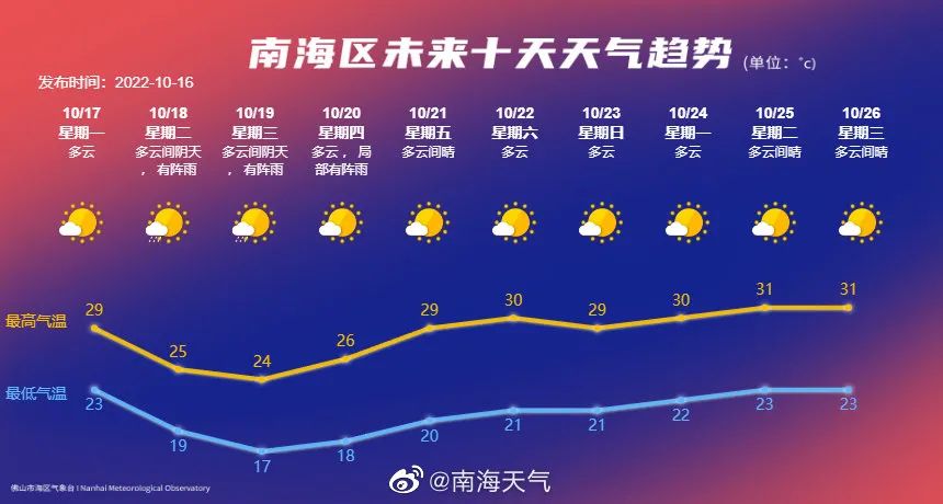 17日,粤东市县有中雨局部暴雨,梅州和珠江口东侧市县有小到中雨,其余市县多云。早晨最低气温:粤西北(韶关和清远)市县14℃~17℃,南部21℃~24℃,其余市县18℃~21℃;白天最高气温:粤北和粤东市县26℃~29℃之间,其余大部市县介于29℃~32℃之间。