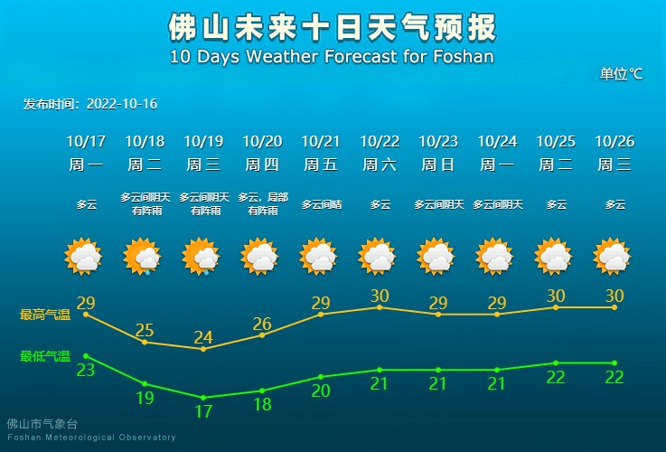 据佛山气象台消息,预计10月17日(今日)白天,受冷空气和“纳沙”叠加影响,佛山北风继续加大,将有8级左右阵风;10月18日到20日,云量增多,间中有阵雨。本次冷空气过程日平均气温下降4~5℃,过程最低气温17℃左右;10月21日到22日冷空气减弱,气温小幅上升;10月23日到26日多云为主。