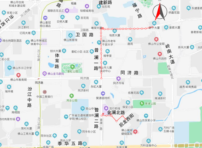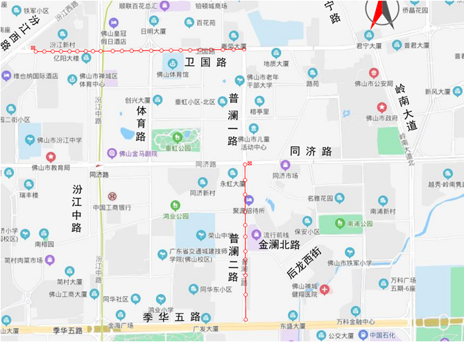 卫国路(汾江西路至福宁路)、普澜一路、普澜二路以及金澜北路(普澜二路至后龙西街)