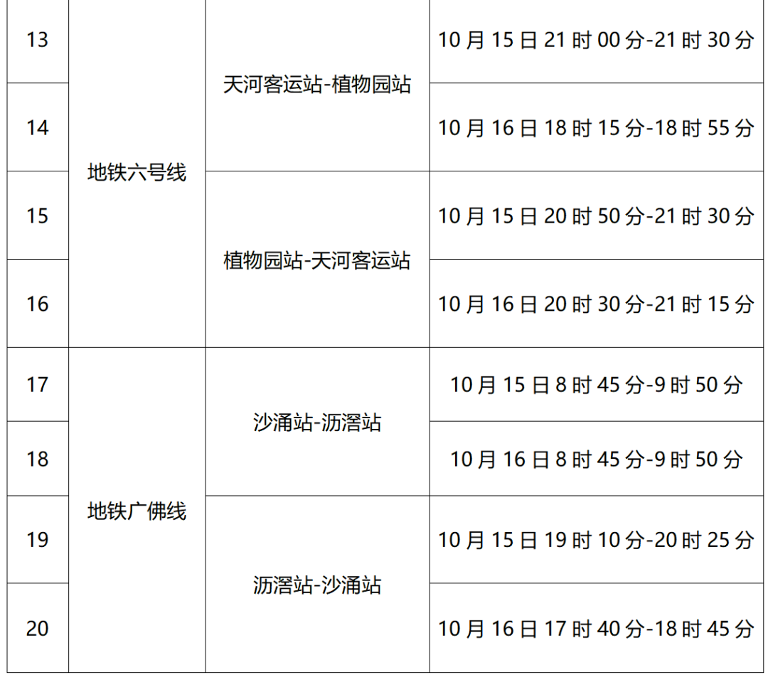 因疫情防控需要,请在10月15日-16日以下时间段相应区间站曾乘坐广州地铁一号线、二号线、三号线、六号线、广佛线以及在相应站内换乘的市民朋友,务必第一时间向所在社区(村)、单位、居住酒店报备,做好个人防护,并配合采取相应的疫情防控措施。