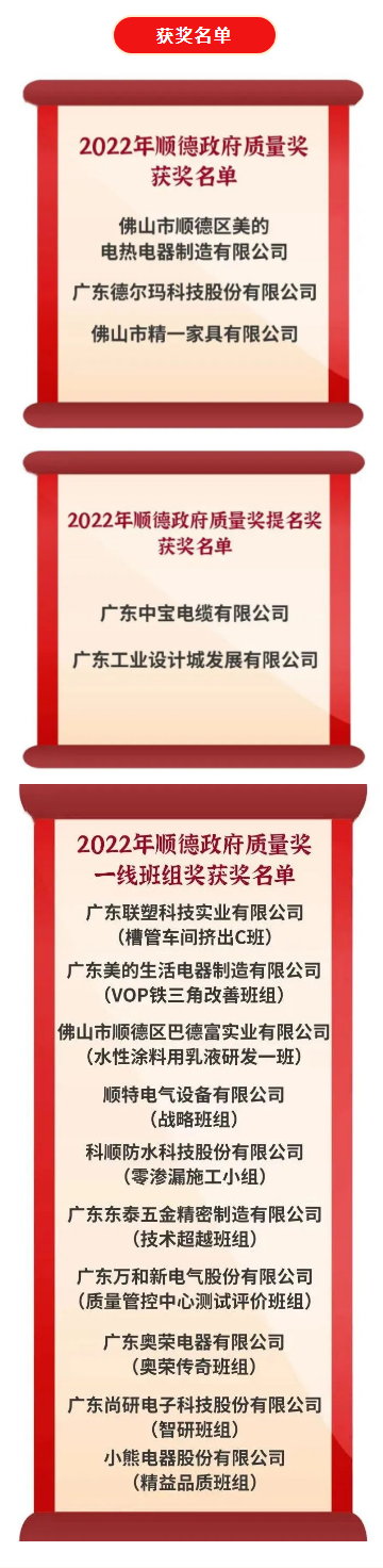 10月11日,2022年顺德政府质量奖获奖名单正式公布,5家企业(组织)以及10个一线班组榜上有名,共获得总额700万元的扶持资金。其中,美的电热电器制造有限公司、广东德尔玛科技股份有限公司、佛山市精一家具有限公司获政府质量奖。
