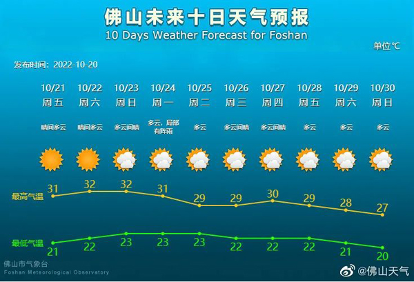 “纳沙”对佛山的大风影响结束。预计今日转多云,气温缓慢回升;10月21到23日晴朗干燥,昼夜温差加大;24到25日云量增多,局部有阵雨。