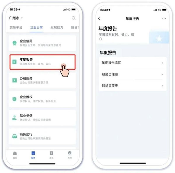 2、打开粤商通APP,点击底部【服务】切换页面,打开服务板块【企业日常】,点击【年报报告】即可进入。