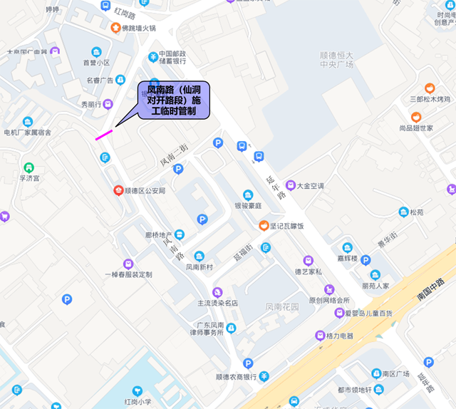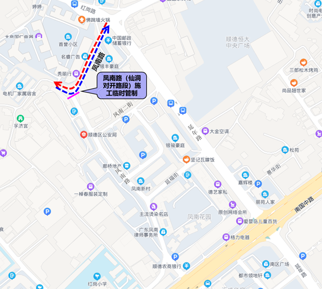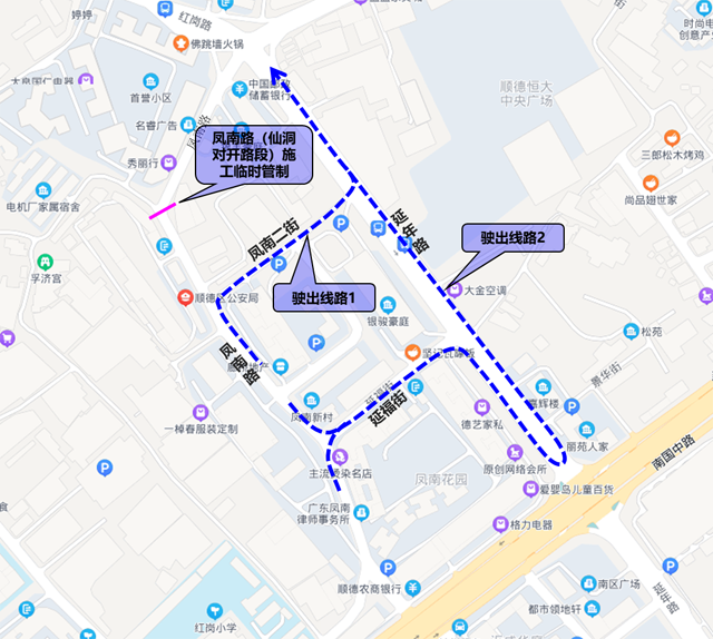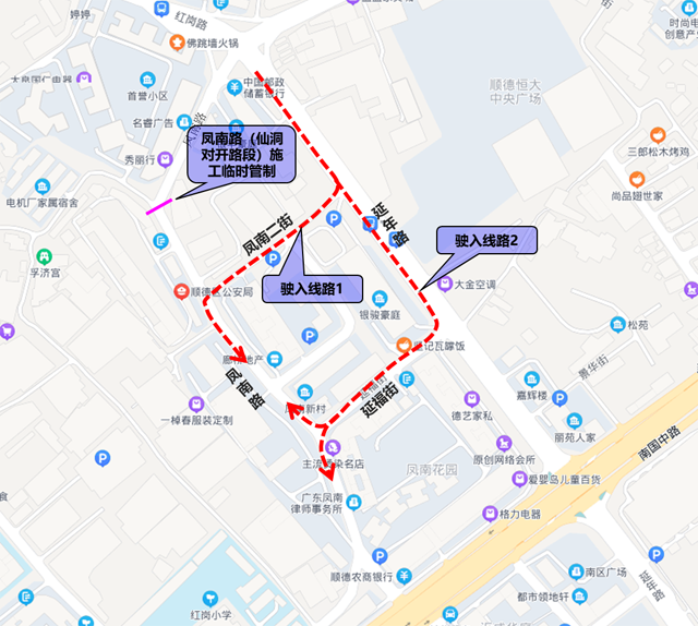 2、顺德公安局、人民法院工作及办事人员与周边片区居民请沿延年路→凤南二街→凤南路或延年路→延福街→凤南路绕行。
