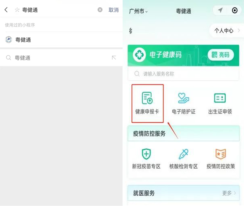 1.健康申报卡登录。用户通过微信搜索登录粤健通小程序,点击“健康申报卡”登录,或者扫描就诊医疗机构的预检分诊健康申报二维码登录。