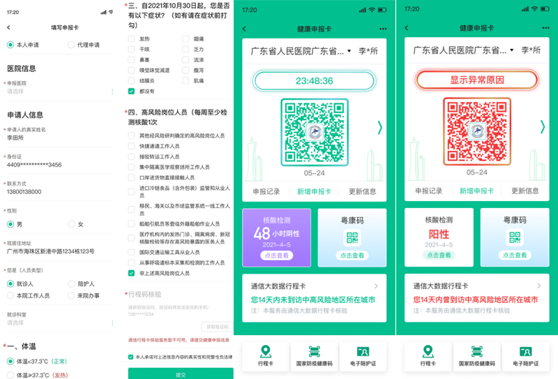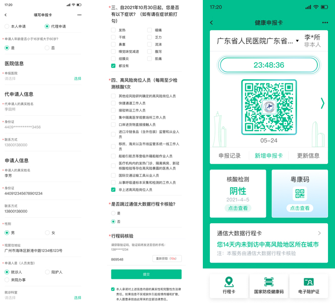 广东省卫生健康委提醒,预检分诊健康申报卡是24小时有效,市民在前往医院就医前,主动登录“粤健通”微信小程序注册,并如实申报个人健康信息。群众填报的个人信息,将严格按照《中华人民共和国个人信息保护法》《中华人民共和国传染病防治法》等法律法规规范使用管理。