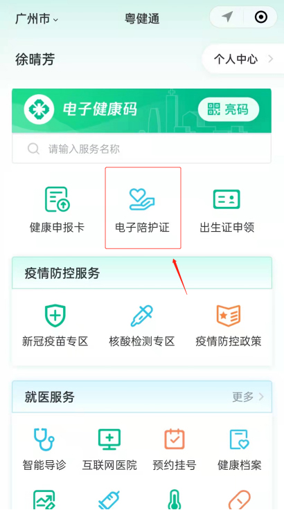 1.用户通过微信搜索登录粤健通小程序,登录“电子陪护证”,或者扫描就诊医疗机构住院处二维码登录电子陪护证申领页面。