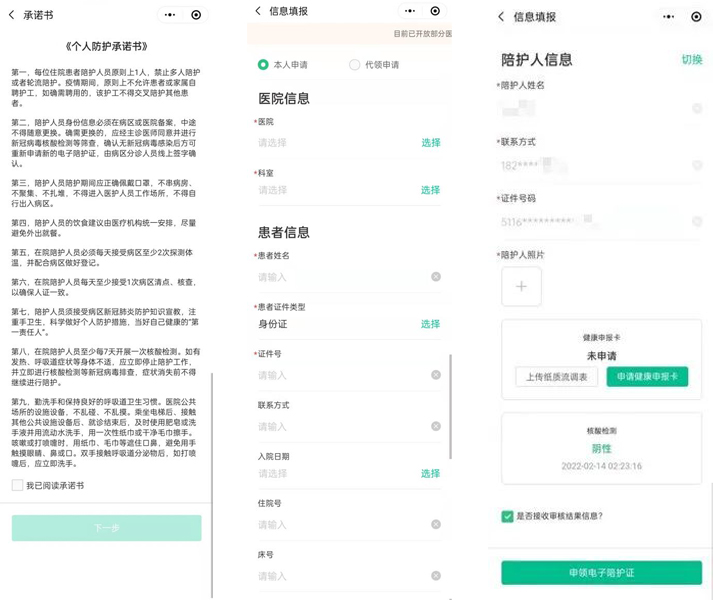 备注:选择医院和科室,填写患者信息和陪护人信息后,系统会自动获取陪护人在该医院当天的健康申报卡信息和7天内核酸检测记录,如无法自动获取信息,则需要申请健康申报卡或上传纸质流调表和手动上传7天内核酸检测纸质报告。