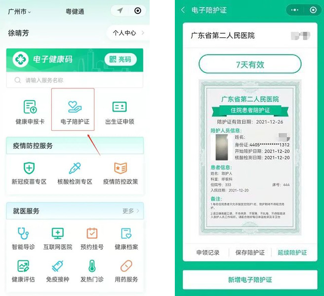 3.查看“电子陪护证”。提交完成,医院审核通过后,可在粤健通微信小程序点击“电子陪护证”查看电子陪护证(有效期7天)。
