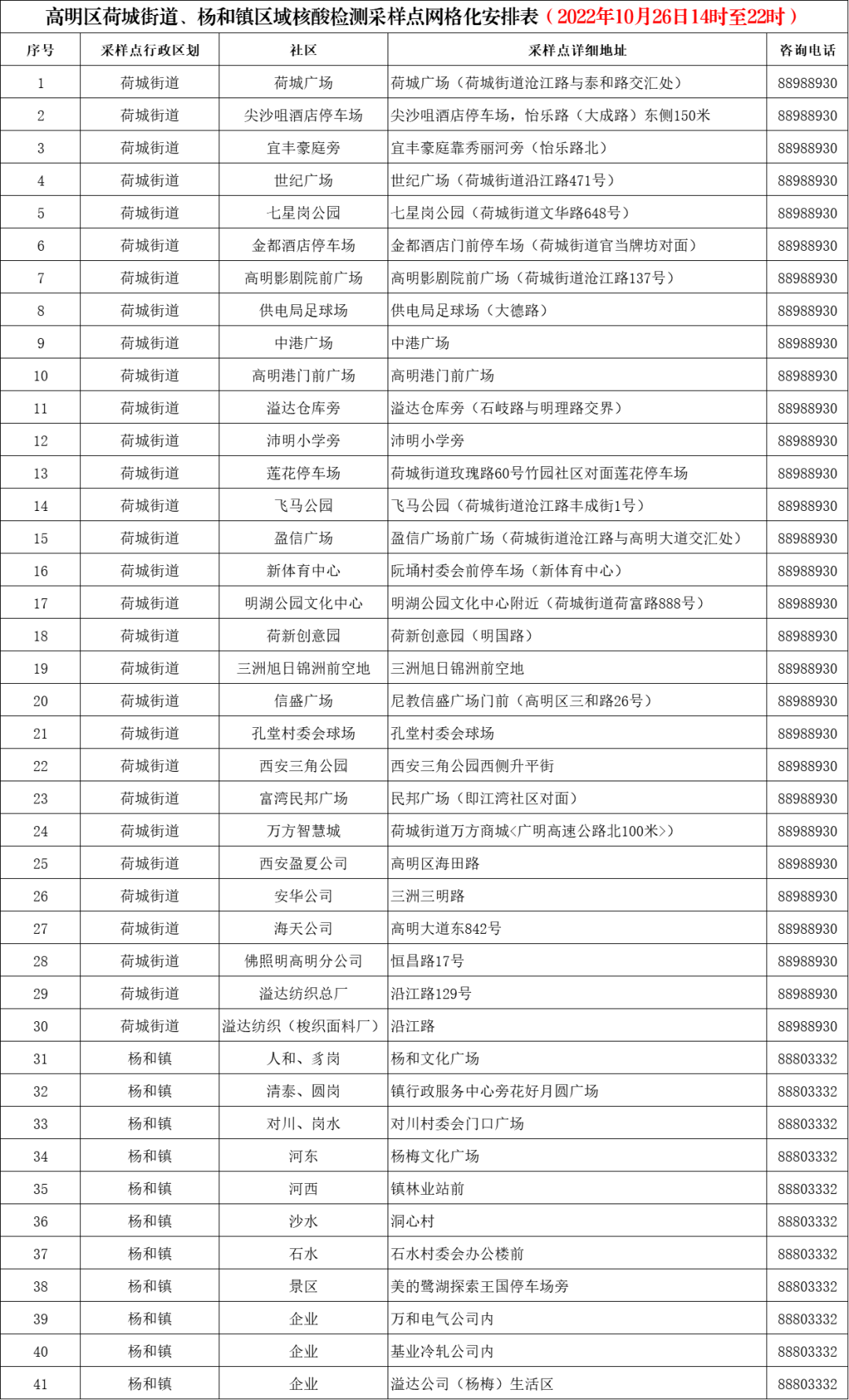 荷城街道、杨和镇共设置41个免费核酸采样点,具体地点详见下表。(以上采样点均不设置“黄码通道”,黄码人员核酸检测点见后文。原来设置在荷城街道、杨和镇的便民核酸检测点在2022年10月26日13时至22时暂停绿码人员采样服务。)