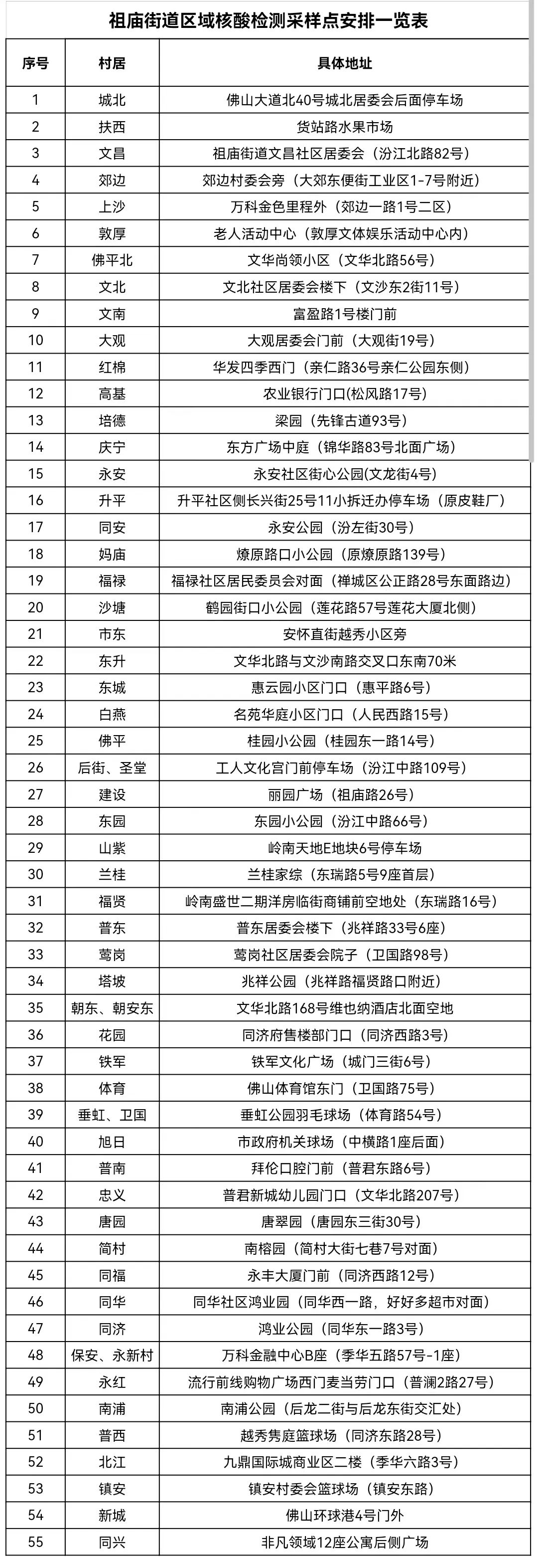 祖庙街道共设置55个免费核酸采样点分区域开展核酸检测 ,具体地点详见附表,请根据居住地所在村(社区)的通知指引,按时段有序前往采样点开展核酸检测,各企事业、园区等单位请配合防控工作,积极发动全体员工参加本轮核酸检测,应检尽检。