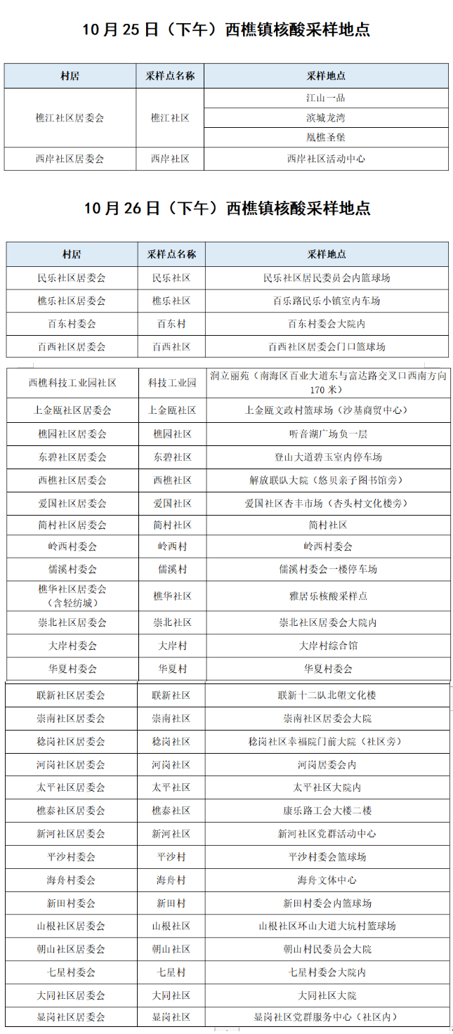 附件∶10月25日、26日西樵镇全员核酸采样地点
