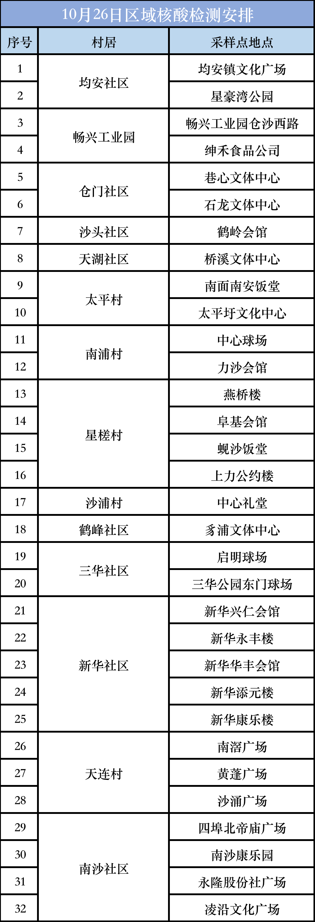均安镇于10月26日上午8:00-11:00,下午5:30至晚上9:00时启动免费区域核酸检测,共设32个采样点,具体安排如下: