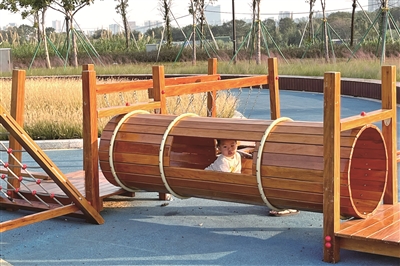 一名幼儿在凤翔湾滨水体育公园内的游乐设施中玩耍。