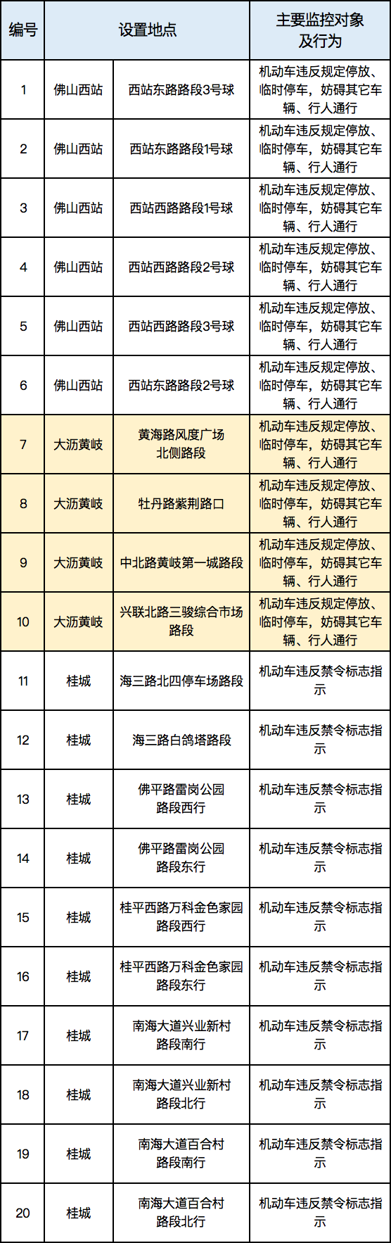根据《中华人民共和国道路交通安全法》、《中华人民共和国道路交通安全法实施条例》、《道路交通安全违法行为处理程序规定》、《广东省道路交通安全条例》等相关法律法规的规定,现将新增的电子监控设备进行公示,该批升级和新增的电子监控设备将于2022年11月10日开始对交通违法行为进行执法取证。请广大车主和驾驶员自觉遵守交通法规,养成良好的文明交通出行习惯,共同营造安全、和谐、畅通的道路交通环境。