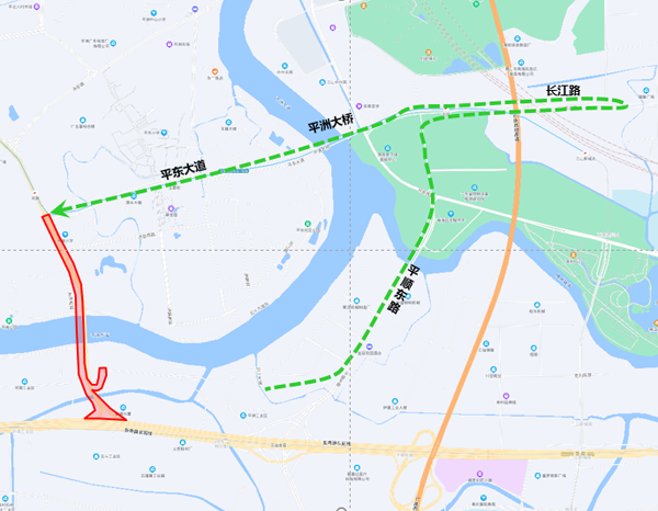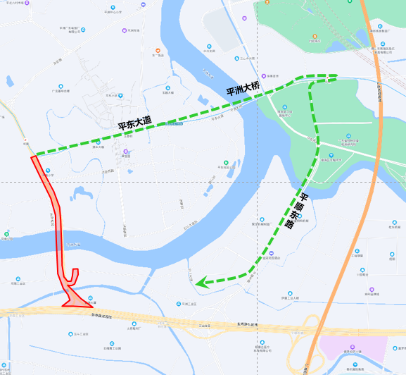 在工程施工期间,为减少对当地企业生产及居民生活的影响,保证过往行人、车辆通行安全及交通干道基本畅通,行人和非机动车绕行平洲大桥路线为:平东大道←→大益西路←→平东大道(平洲大桥)←→长江路←→平顺东路←→平南工业区。
