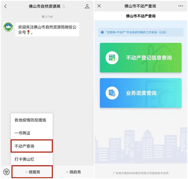 关注“佛山市自然资源局”微信公众号→点击“微服务”→点击“不动产查询”→根据指示操作。