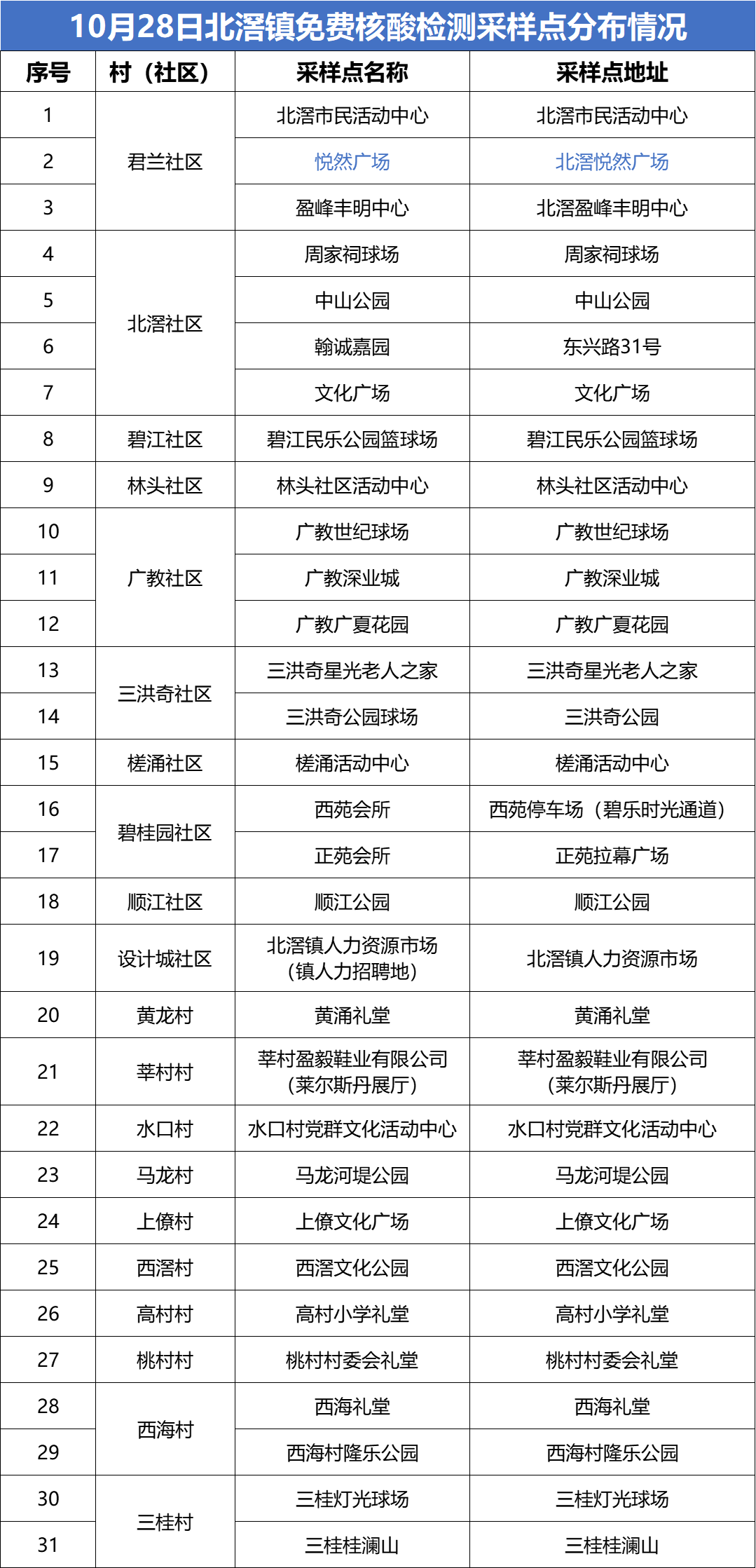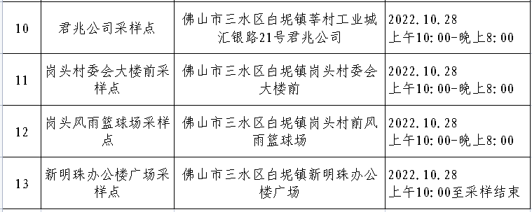 10月28日,丹灶便民核酸采样点最新安排如下,有需要的街坊可就近前往。