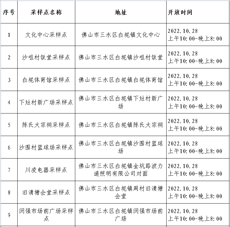 白坭镇全员核酸检测采样点开放一览表