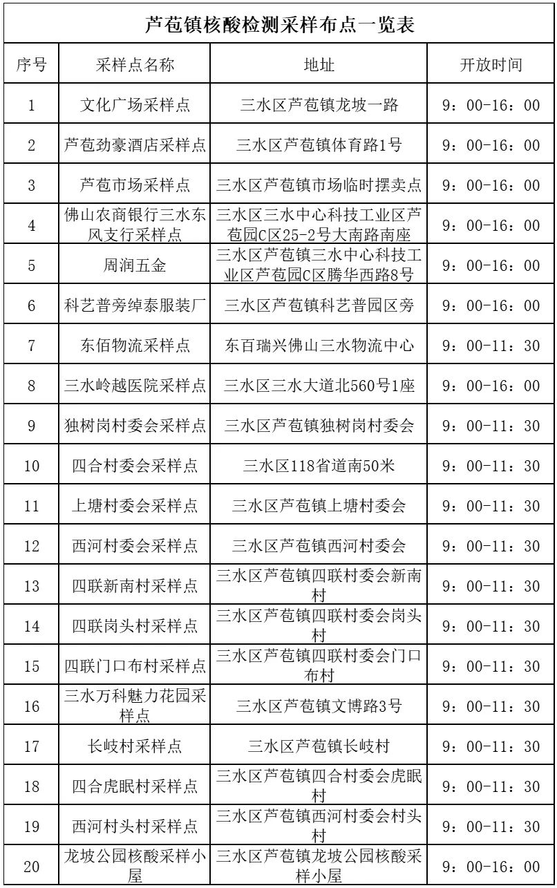三、核酸点位及时间安排:本轮全员核酸检测全镇共设置20个采样点开展免费核酸检测服务,具体核酸检测点位及时间安排见下图: