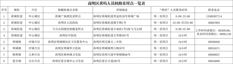 3.请持黄码以及收到短信提醒的居民朋友,就近到黄码核酸采样点通过黄码通道进行核酸检测,黄码采样点及服务时间如下: