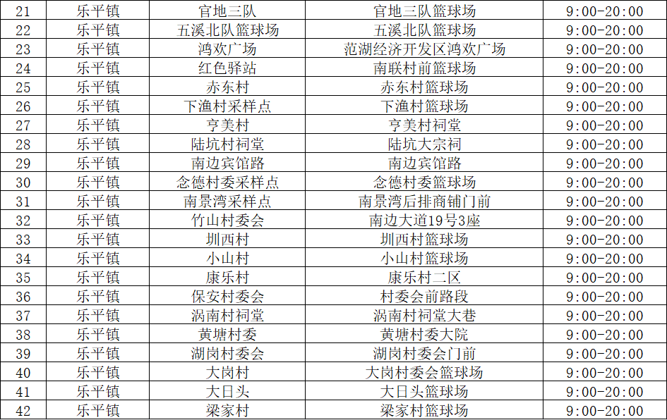 三、核酸点位及时间安排:本轮全员核酸检测设置42个采样点开展免费核酸检测服务,具体核酸检测点位及开放时间见下表: