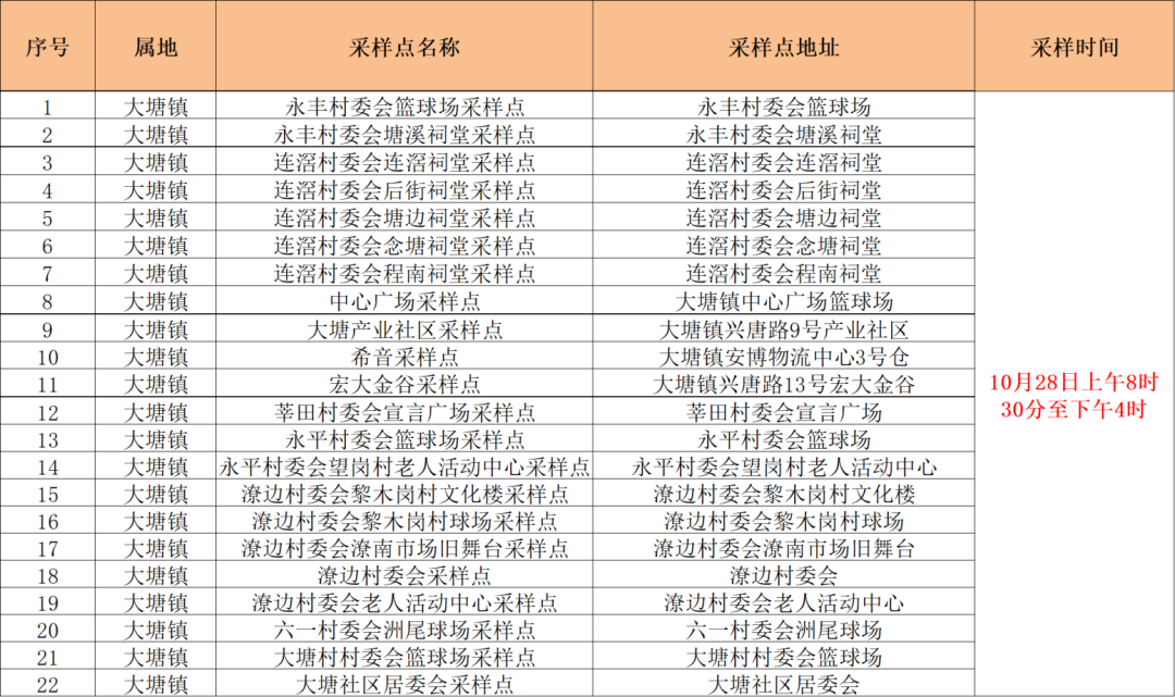 根据最新疫情防控形势,为切实保障广大人民群众生命安全和身体健康,按照区的统一安排,大塘镇定于2022年10月28日上午8时30分至下午4时,在全镇范围内开展全员核酸检测。现就有关事项通告如下: