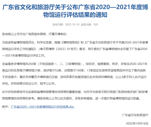 此次评估由广东省博物馆协会根据《博物馆条例》和《广东省文化和旅游厅关于开展2020-2021年度博物馆运行评估工作的通知》(粤文旅博物〔2022〕81号文)要求,对全省需参评的260家博物馆进行各项专业评审,共有25家博物馆被评为优秀等次,清晖园博物馆正名列其中。